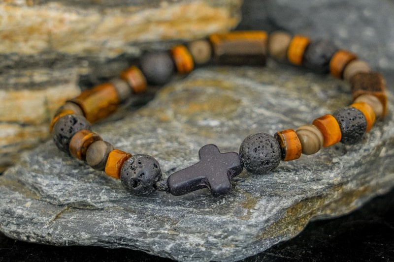 Wyraź swoją siłę i wyjątkowość z naszą męską bransoletką z kamieniami Tygrysie Oko i krzyżem - doskonałym dodatkiem do każdej męskiej stylizacji i talizmanem pełnym pozytywnej energii.
