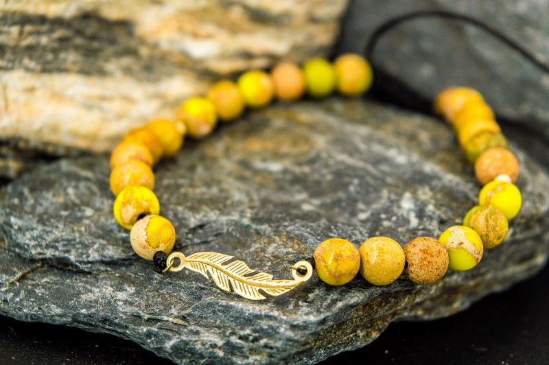 Ta damska bransoletka z naturalnych kamieni, w tym jaspisu, z eleganckim złotym elementem pióra to piękna ozdoba na każdą okazję. Dostępna w różnych kolorach kamieni, umożliwia dopasowanie do indywidualnych preferencji kolorystycznych i stylu.