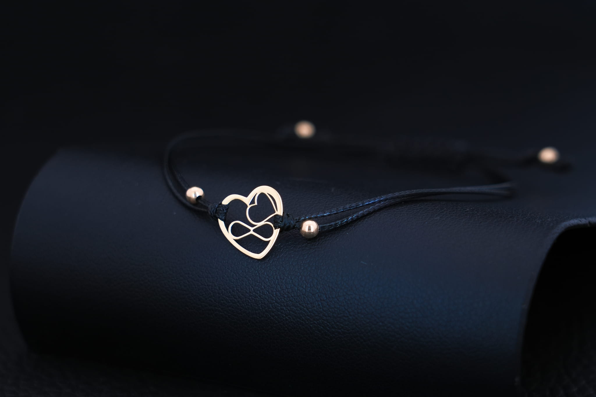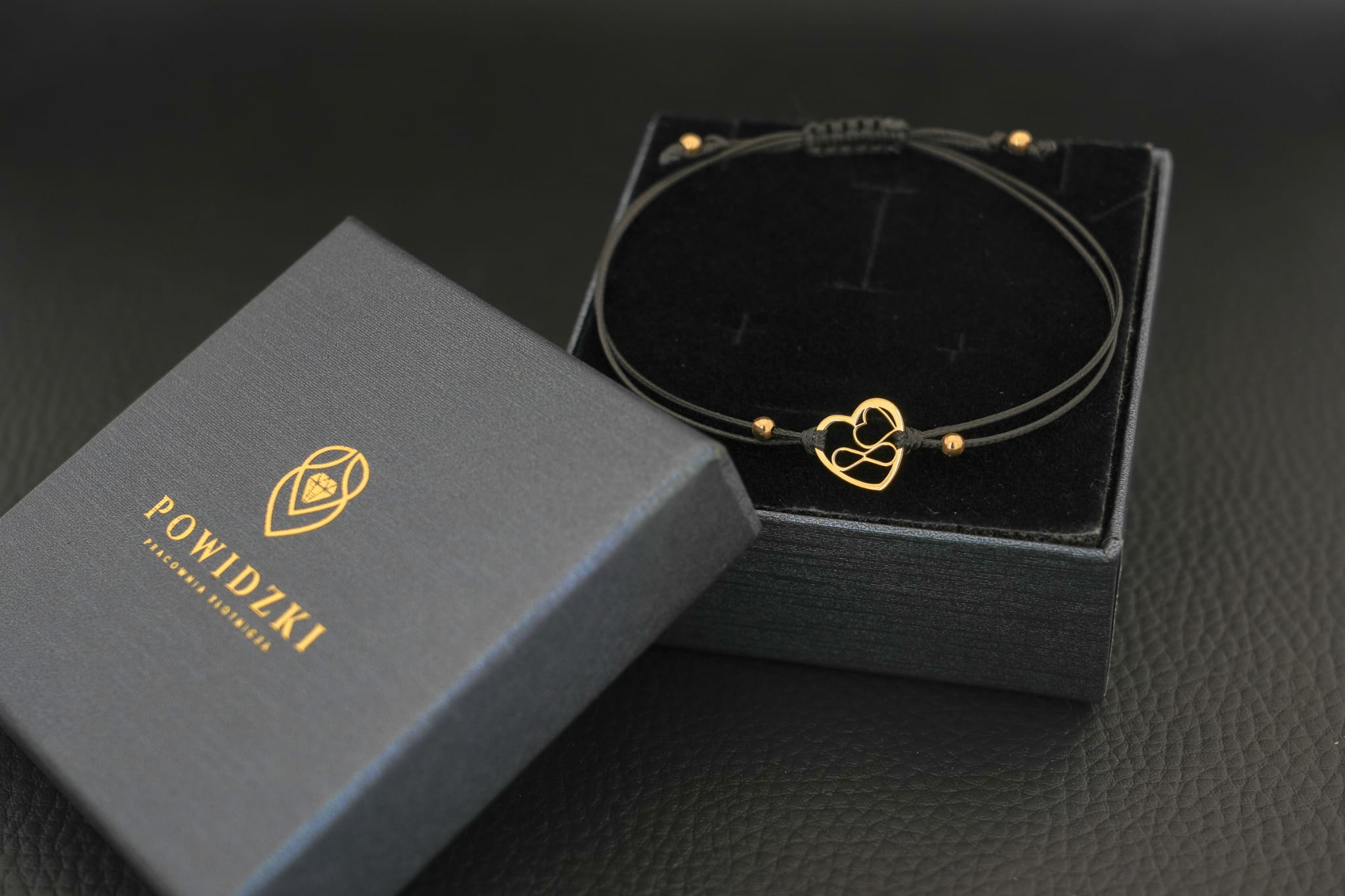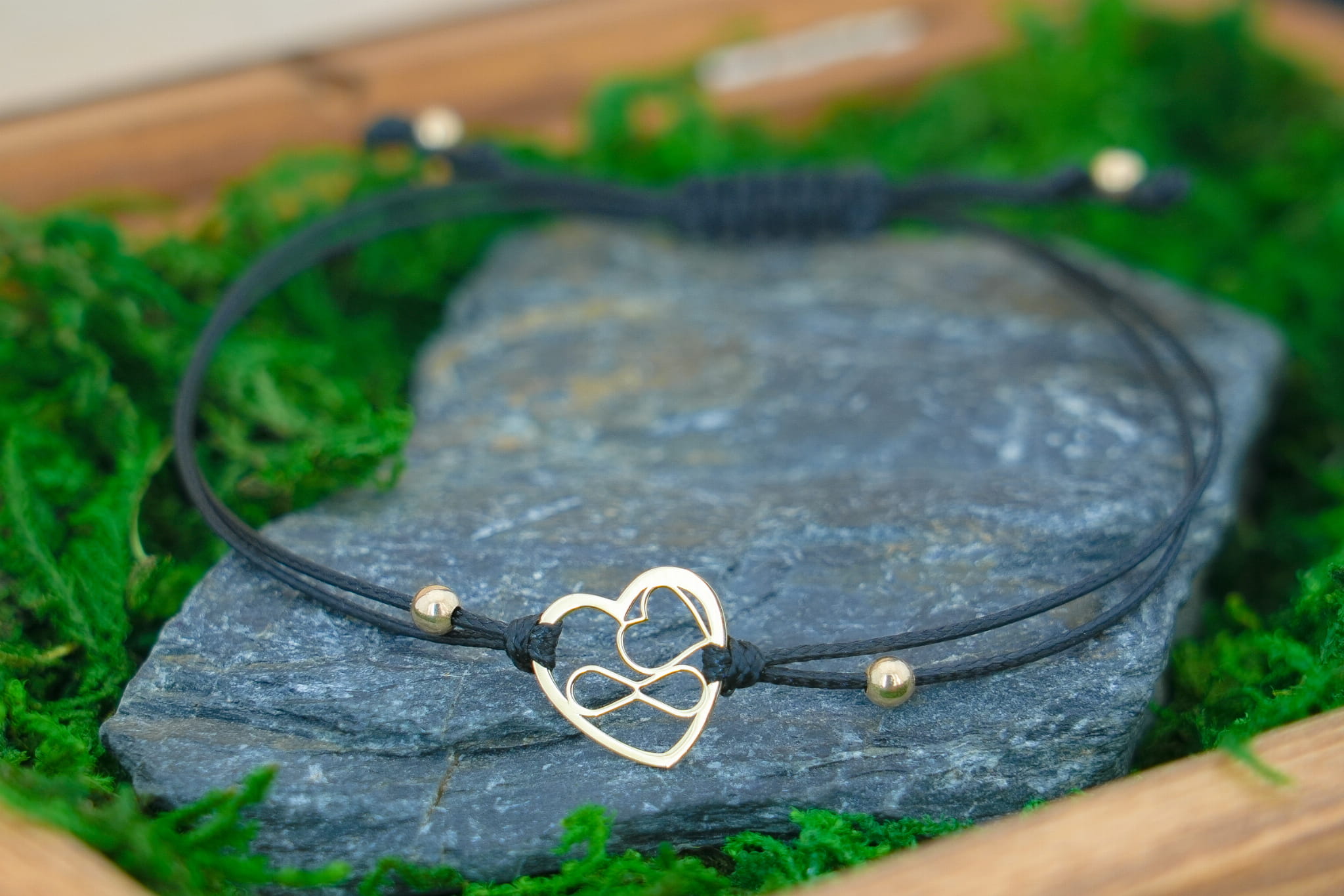 Wyraź swoje najgłębsze uczucia z wyjątkową bransoletką sznurkową, której głównym motywem jest złote serce z mniejszym sercem w środku, ozdobionym symbolem nieskończoności. To nie tylko piękna ozdoba, ale także głęboki symbol wiecznej miłości, przyjaźni lub oddania.