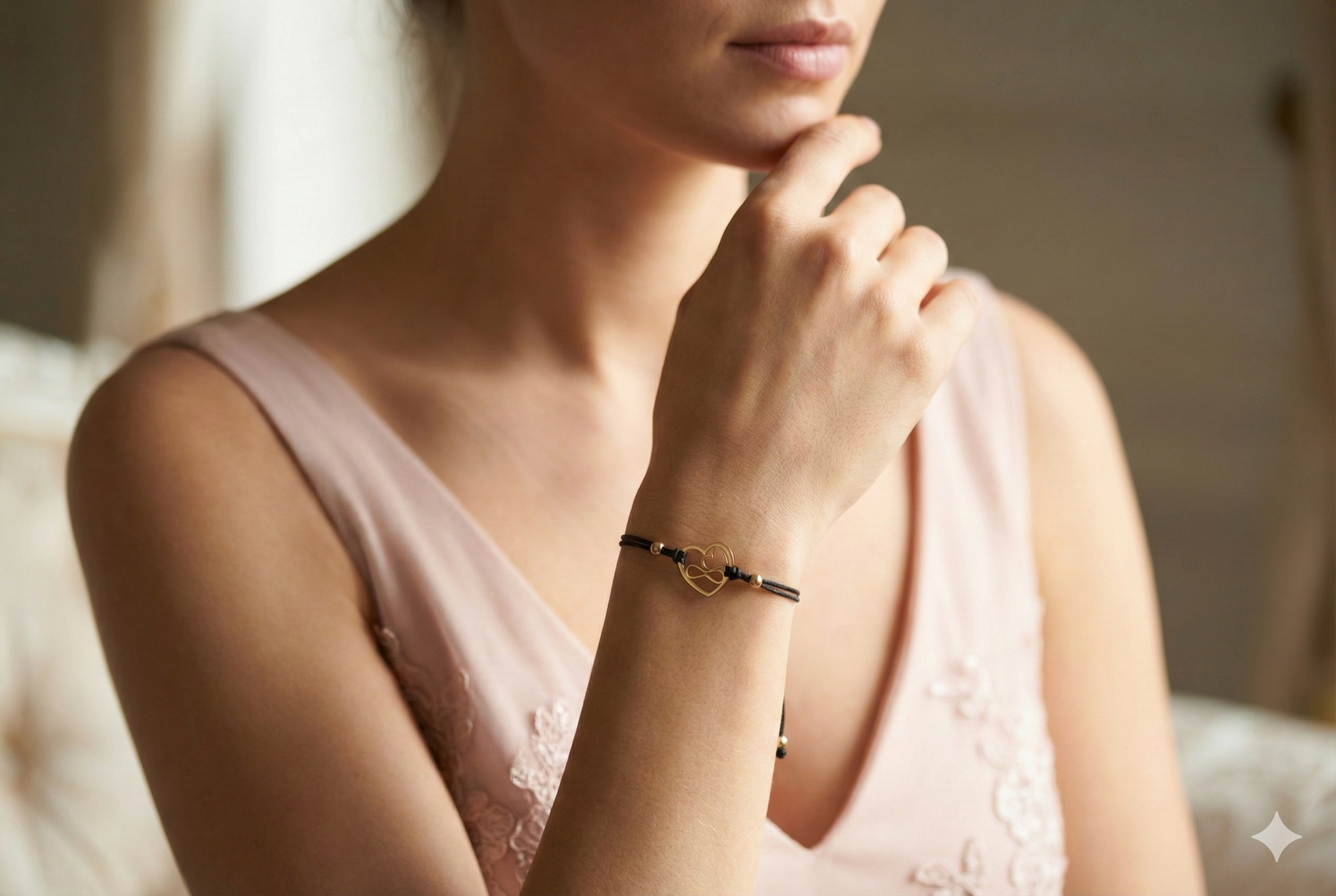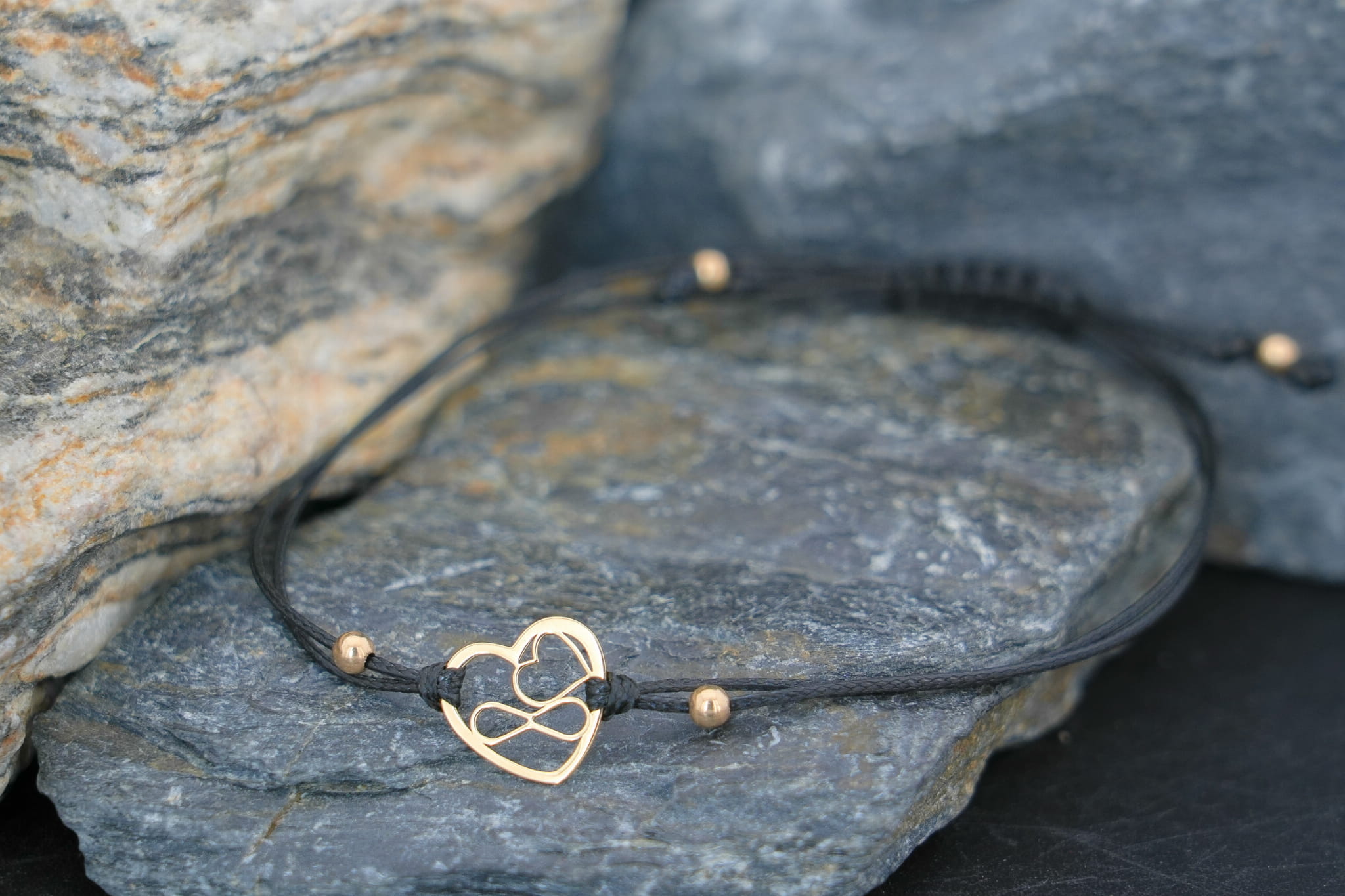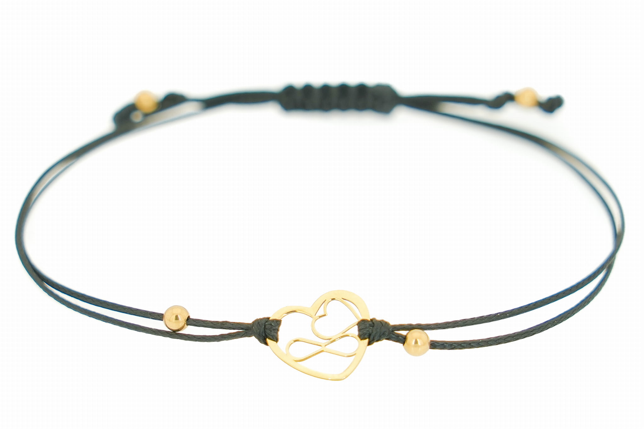 Wyraź swoje najgłębsze uczucia z wyjątkową bransoletką sznurkową, której głównym motywem jest złote serce z mniejszym sercem w środku, ozdobionym symbolem nieskończoności. To nie tylko piękna ozdoba, ale także głęboki symbol wiecznej miłości, przyjaźni lub oddania.
