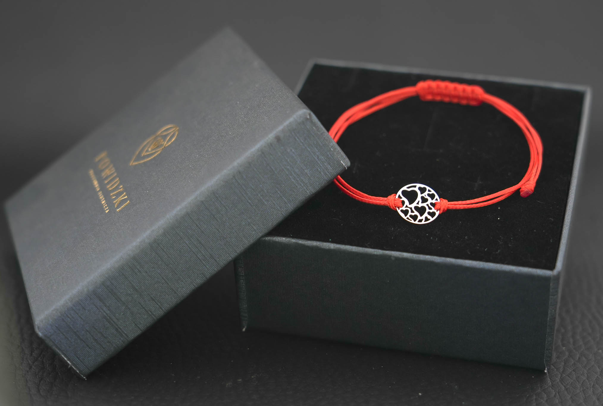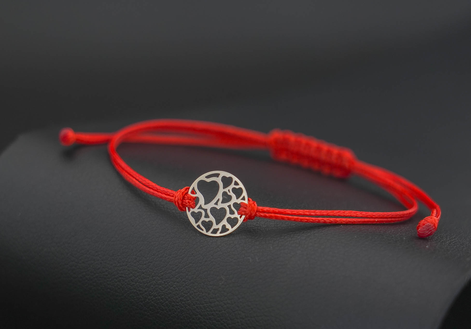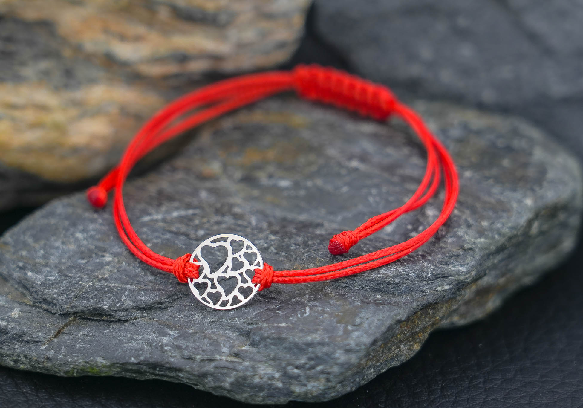 Srebrna Bransoletka na Czerwonym Sznurku – Ażurowe Koło z Sercami