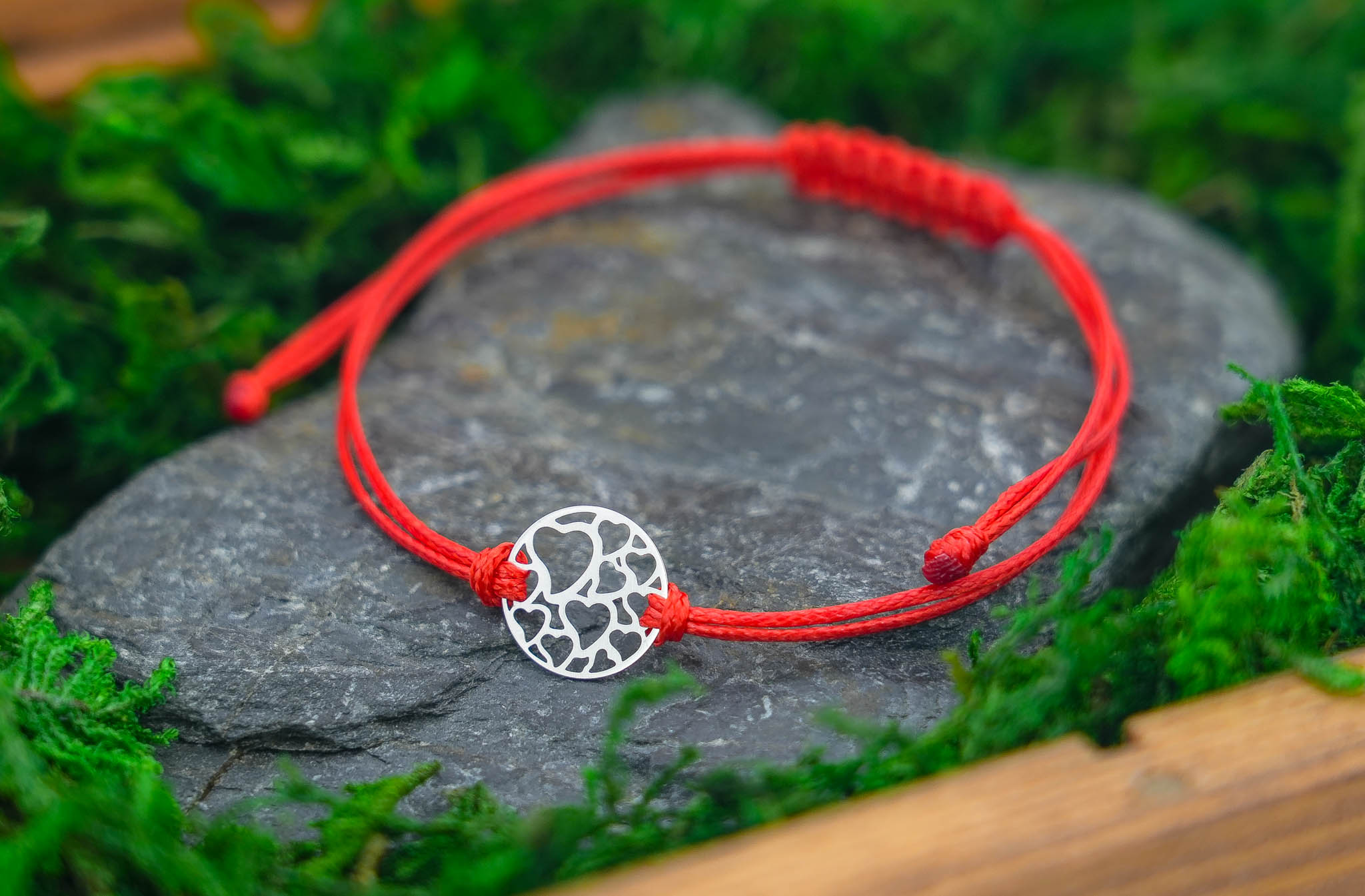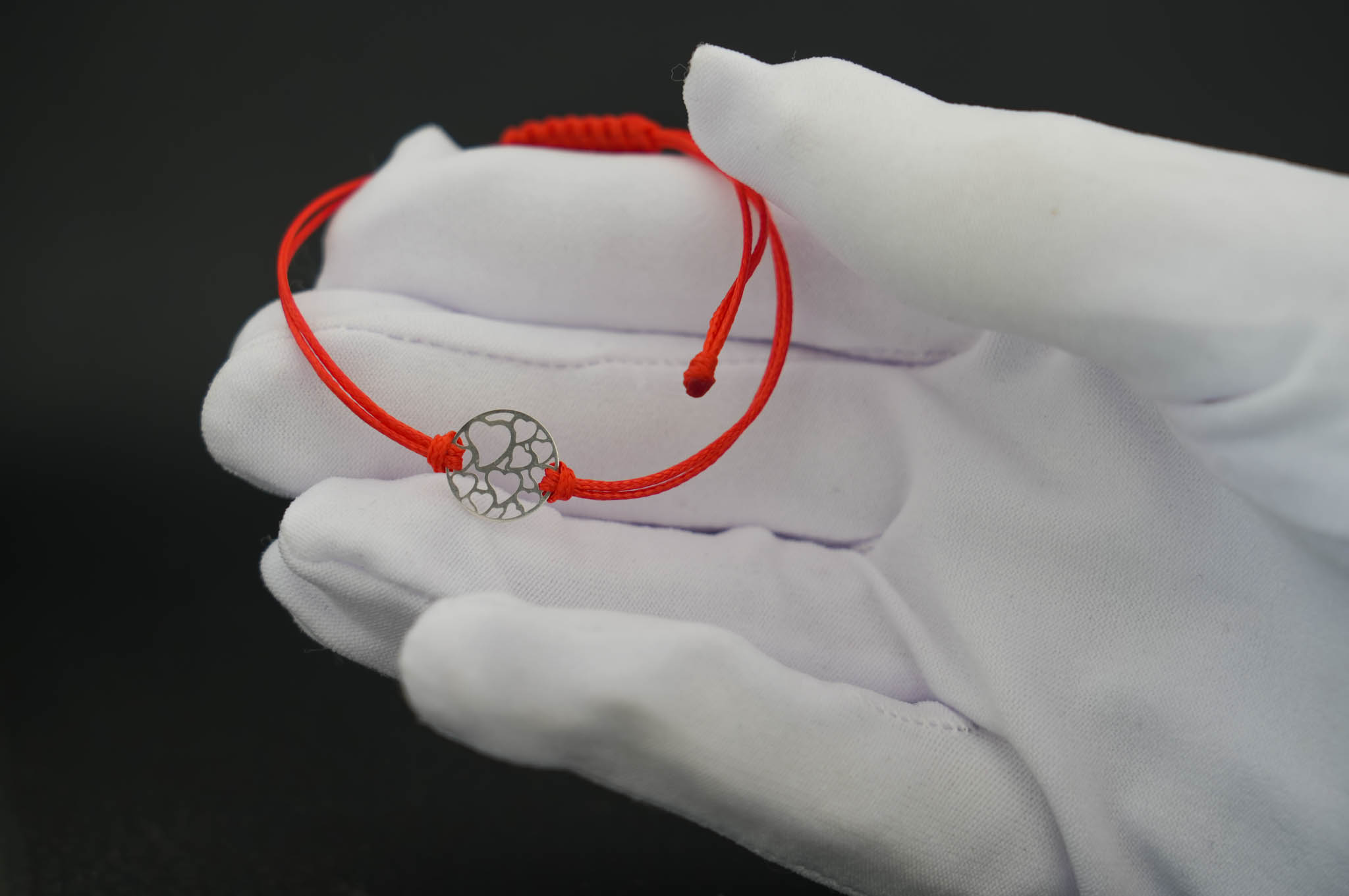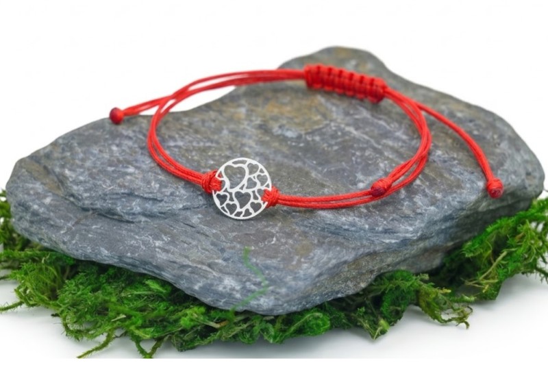 Srebrna Bransoletka na Czerwonym Sznurku – Ażurowe Koło z Sercami