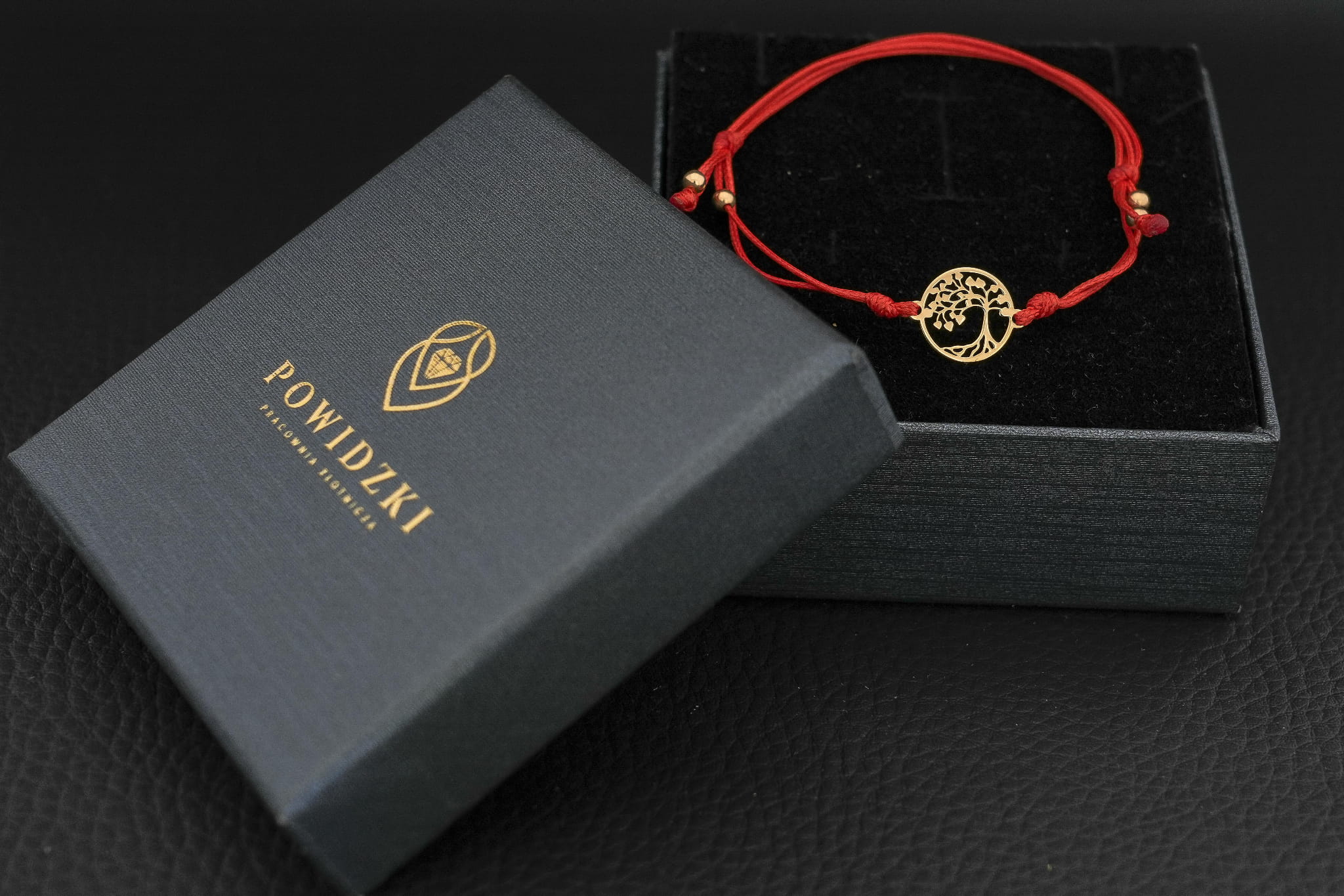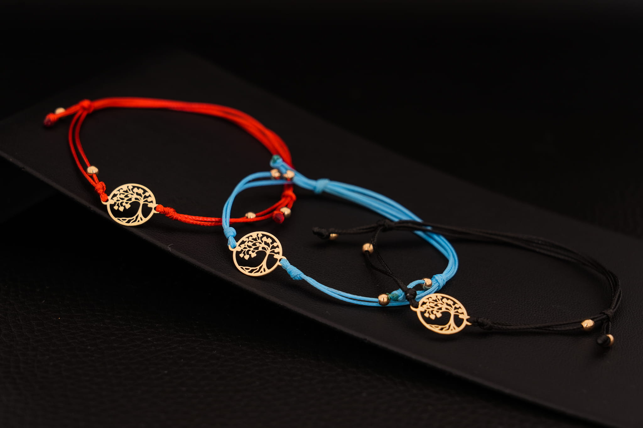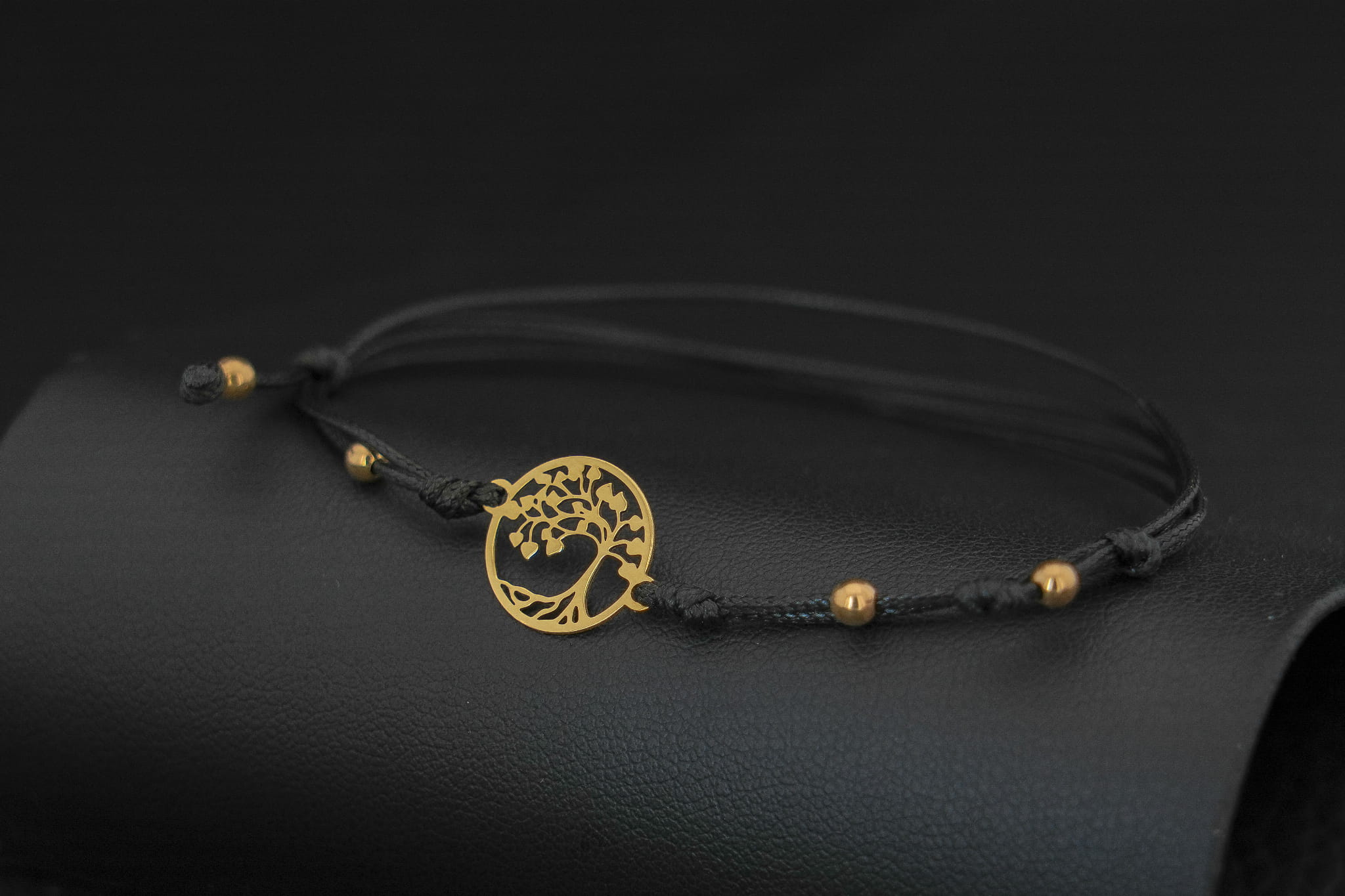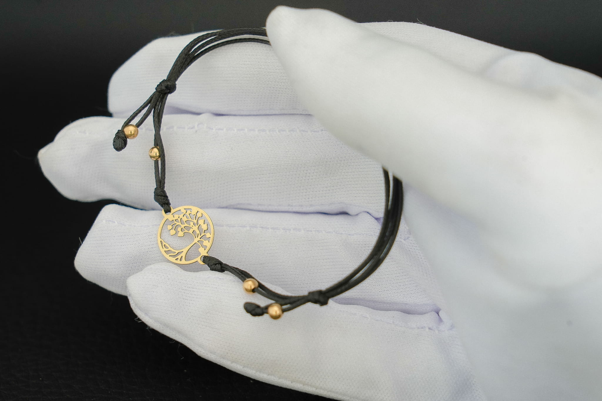 Złoty motyw został wpleciony w cienki, elegancki i bardzo wytrzymały sznurek jubilerski. Aby bransoletka idealnie pasowała do Twojego stylu lub intencji, oferujemy wybór spośród trzech kolorów sznurka: