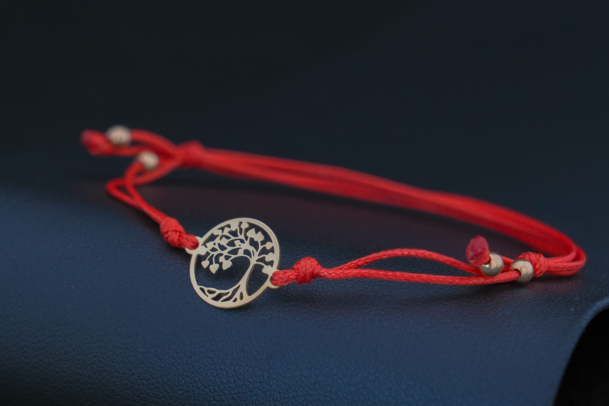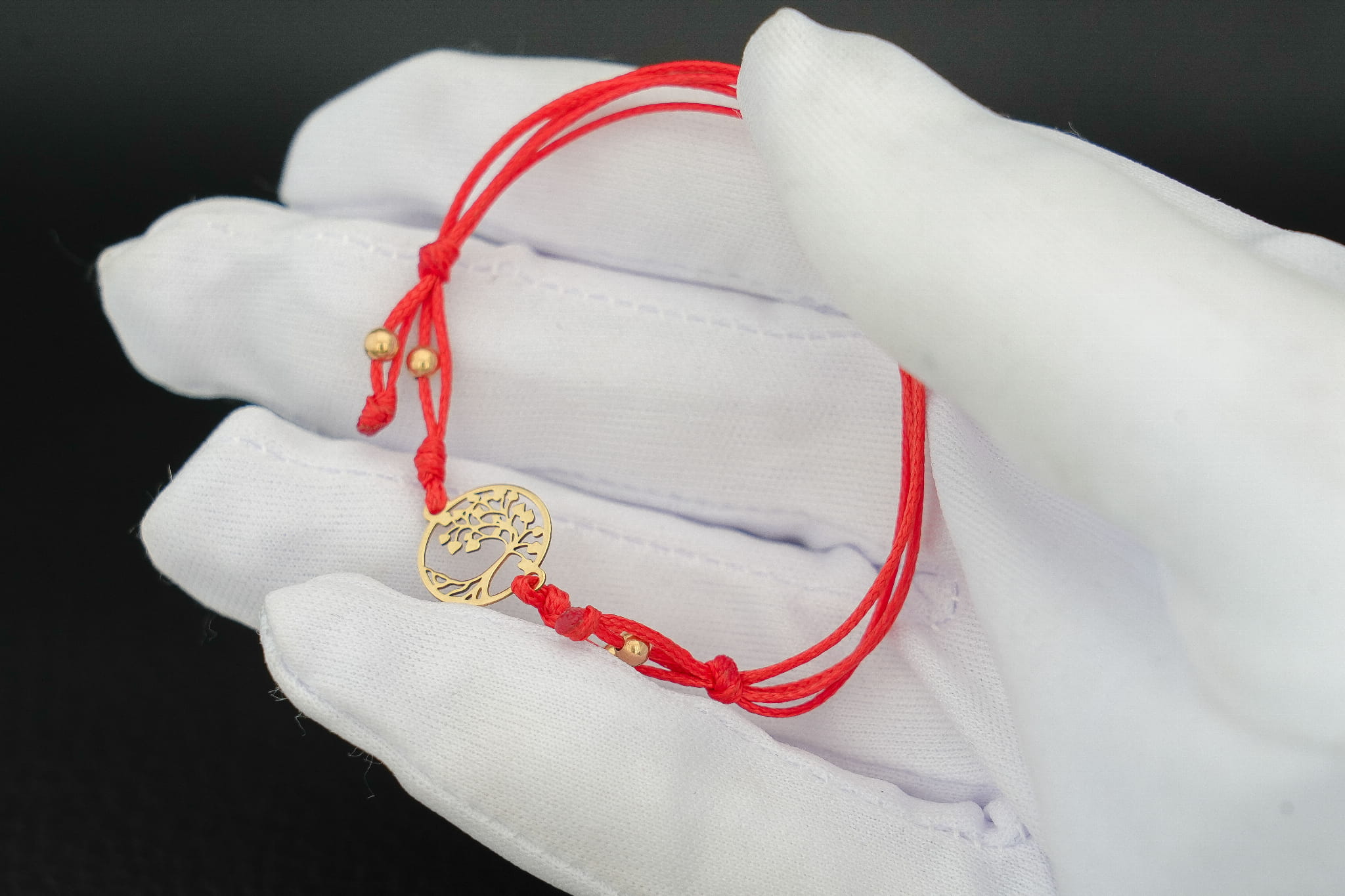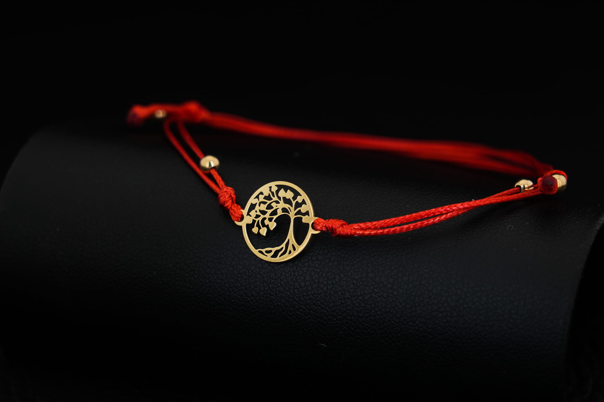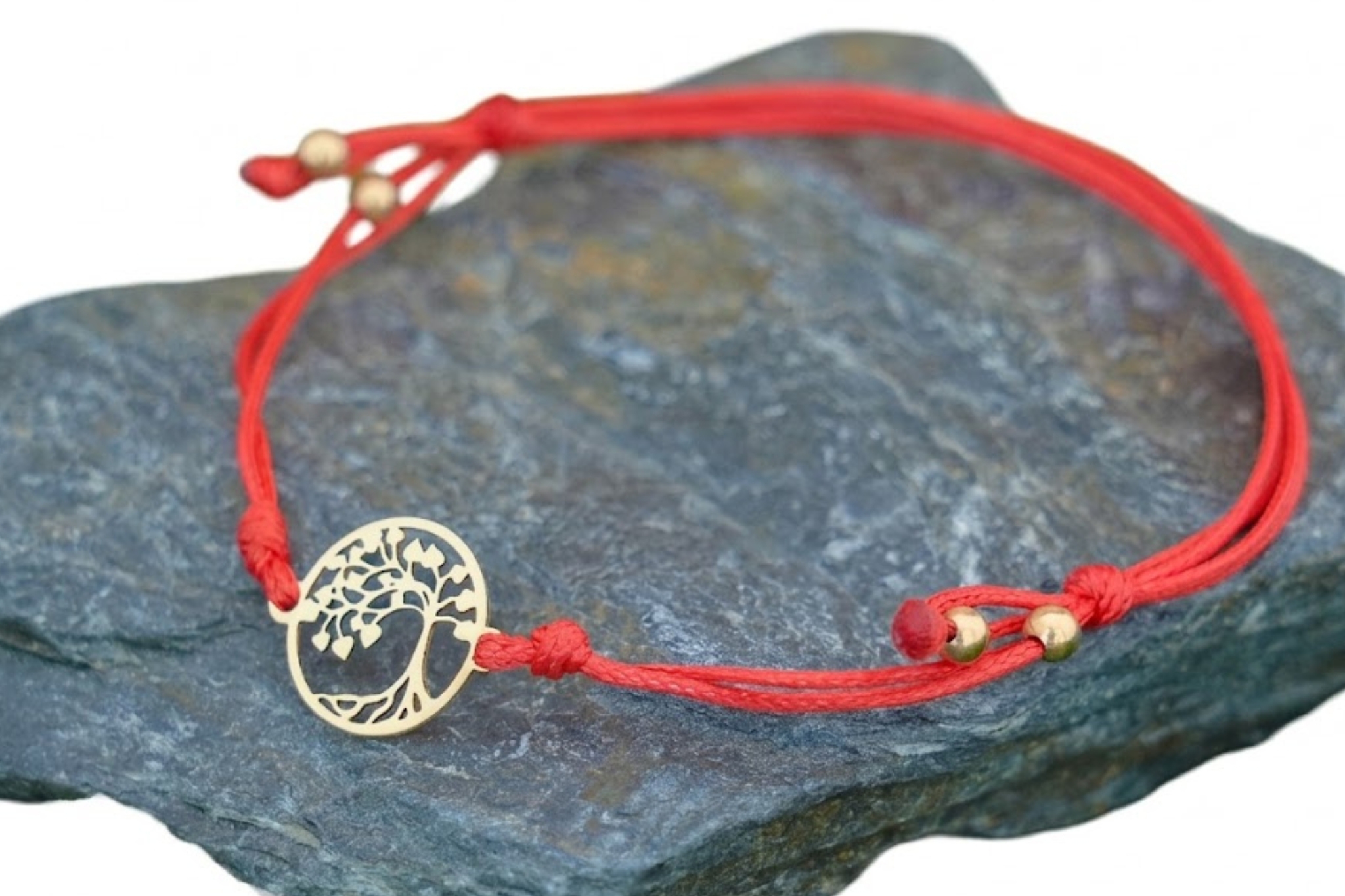 Złoty motyw został wpleciony w cienki, elegancki i bardzo wytrzymały sznurek jubilerski. Aby bransoletka idealnie pasowała do Twojego stylu lub intencji, oferujemy wybór spośród trzech kolorów sznurka: