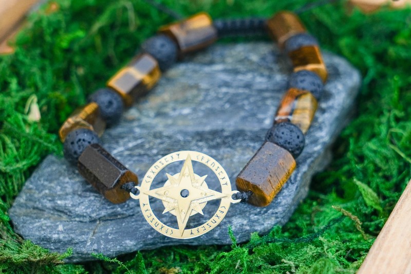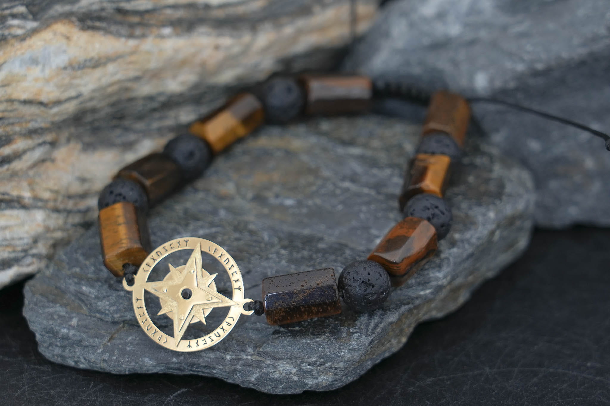 W centrum bransoletki znajduje się ręcznie wykonany złoty element z kompasem ozdobionym runami Odyna. Został on osadzony między kamieniami o unikalnych właściwościach – lawa wulkaniczna sprzyja uziemieniu, a tygrysie oko symbolizuje odwagę i klarowność umysłu.