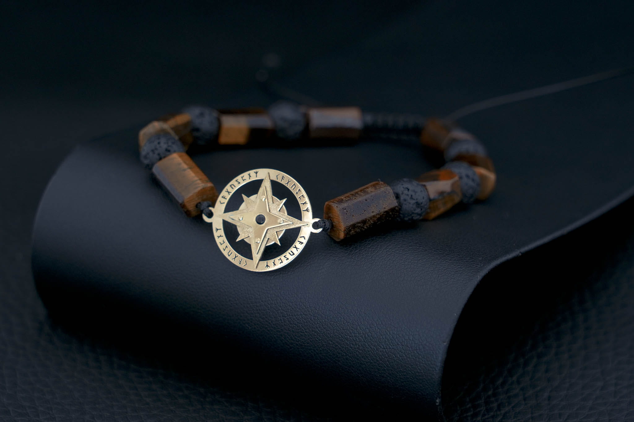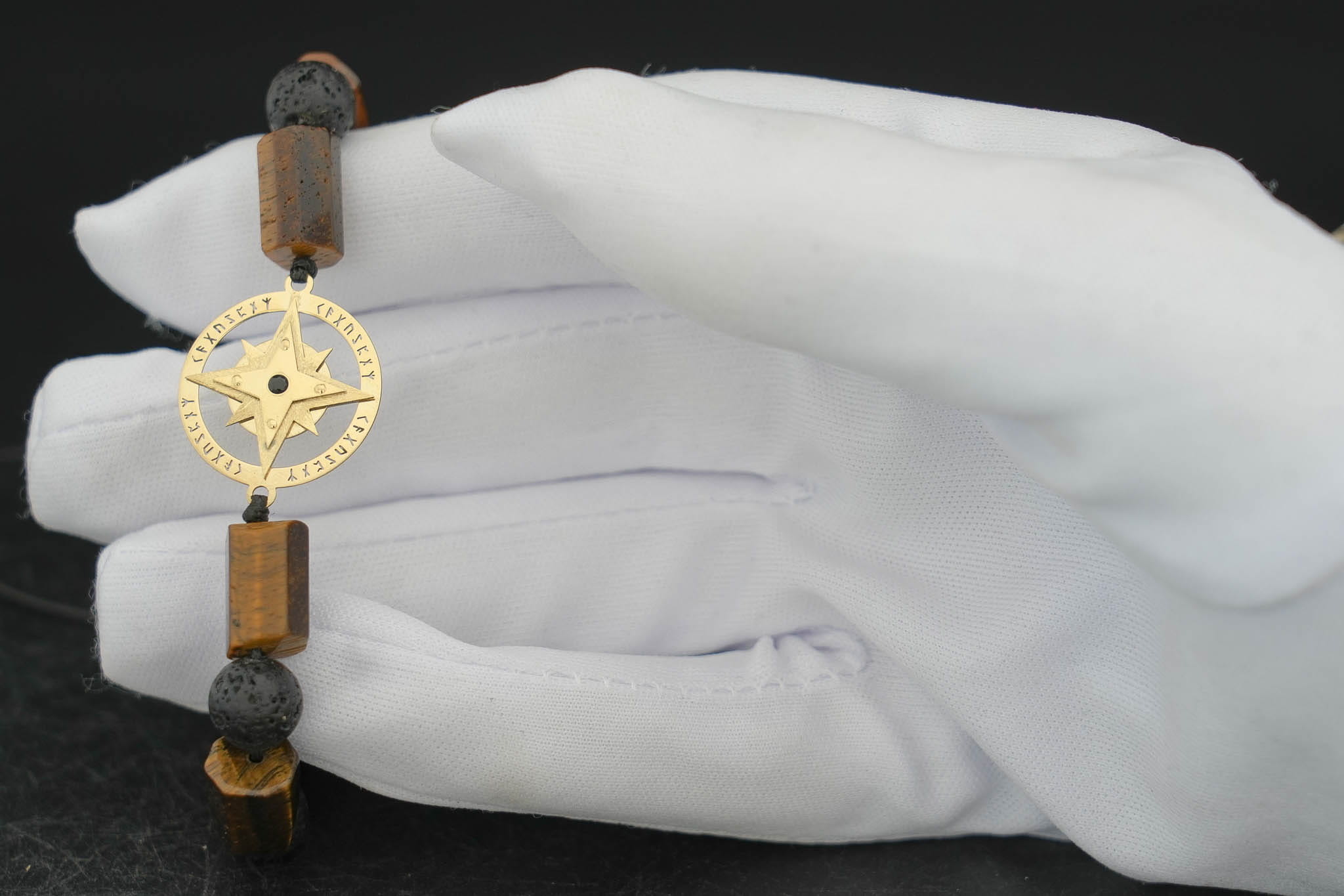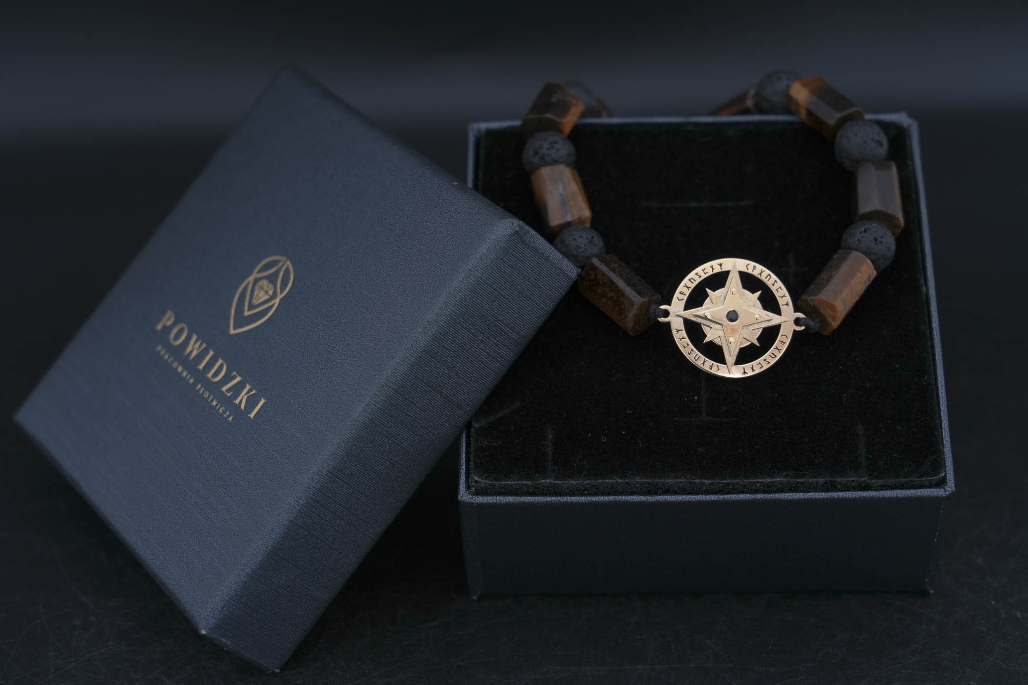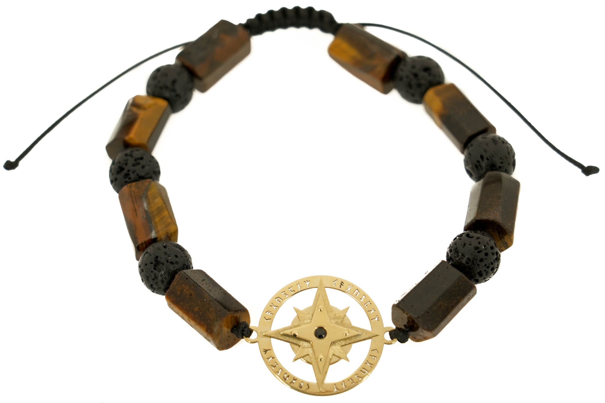 Symbol siły, ochrony i wewnętrznego przewodnictwa – Bransoletka Kompas z Runami Odyna to wyjątkowe połączenie złota próby 585 i naturalnych kamieni: czarnego kamienia wulkanicznego oraz tygrysiego oka.