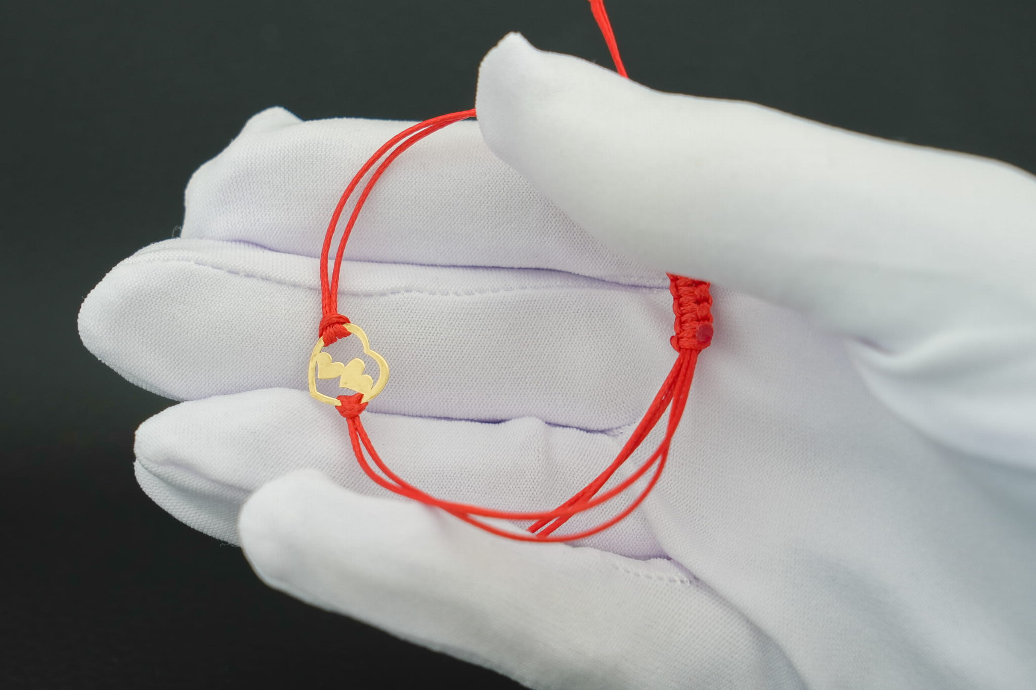 Element ze szlachetnego kruszcu został wpleciony w wytrzymały, czerwony sznurek. Dzięki procesowi woskowania sznurek jest odporny na wilgoć, nie mechaci się i zachowuje intensywną barwę, pięknie kontrastującą ze złotem.
