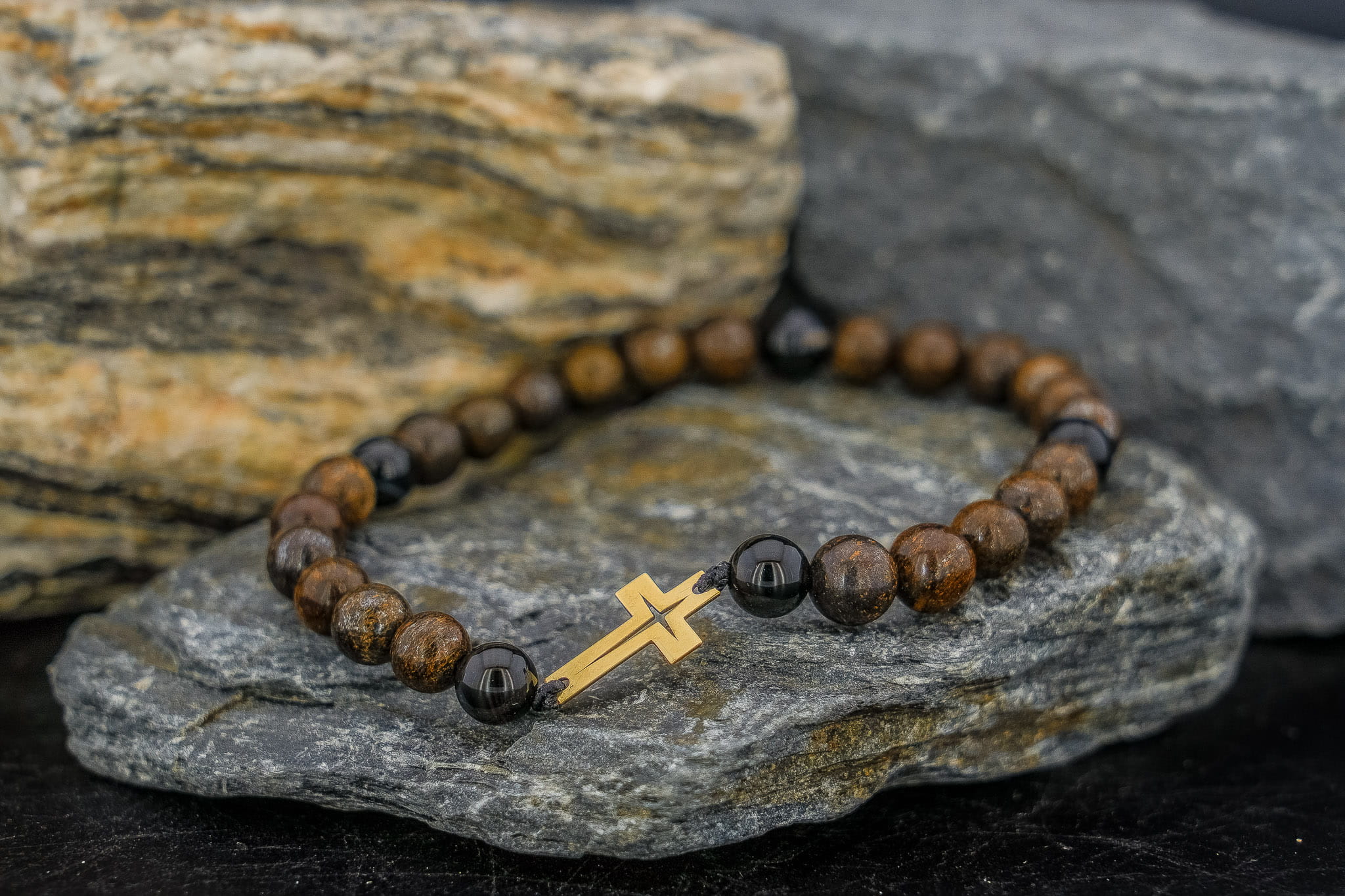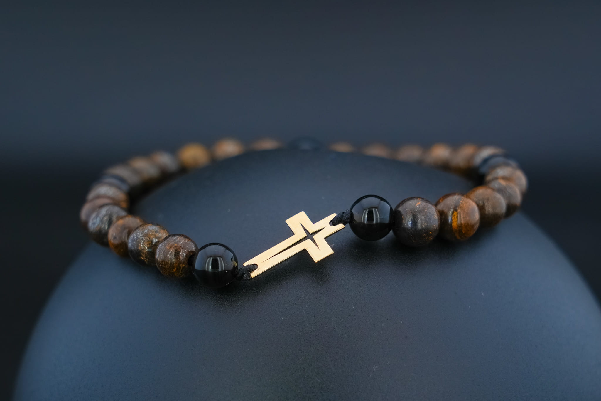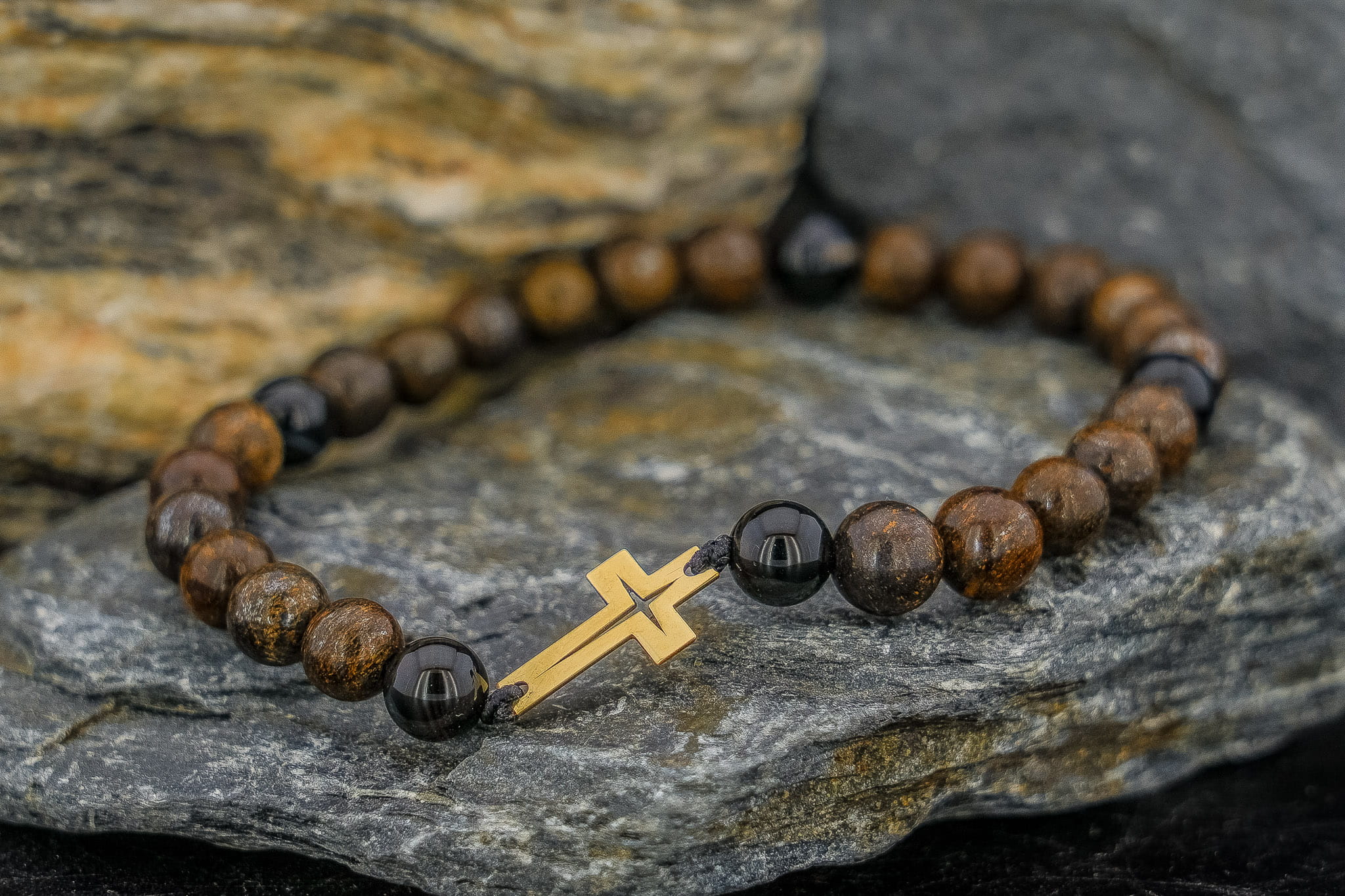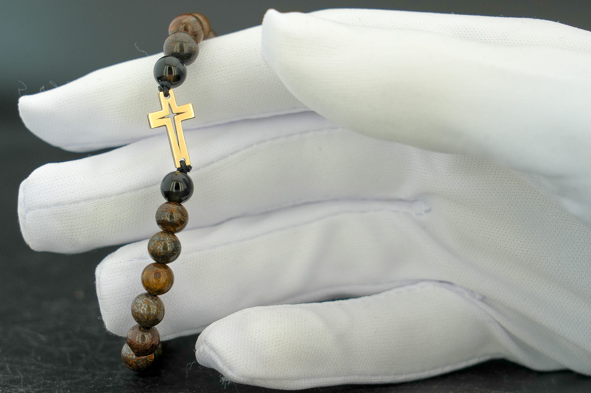 Męska Bransoletka z Kamieni Naturalnych – Złoty Krzyż Próba 375