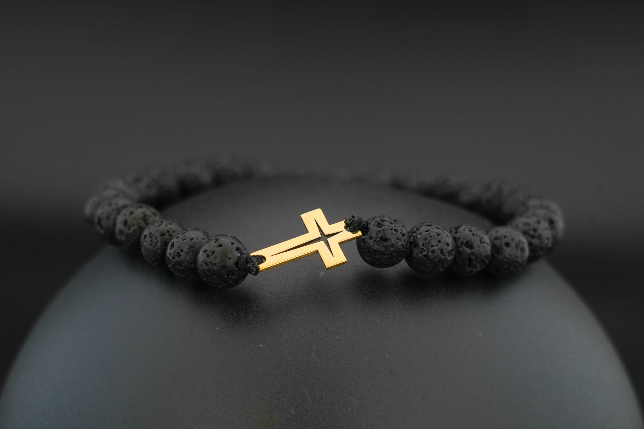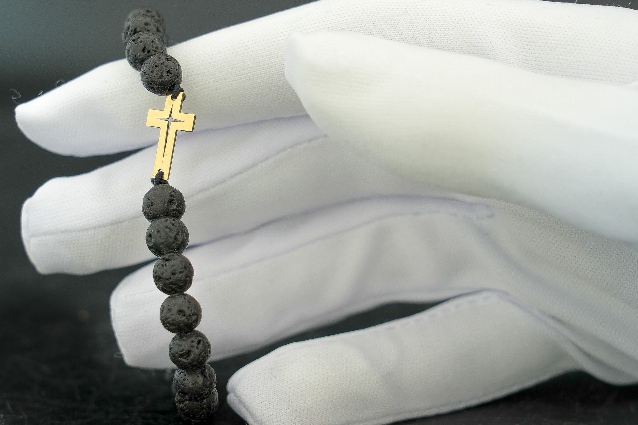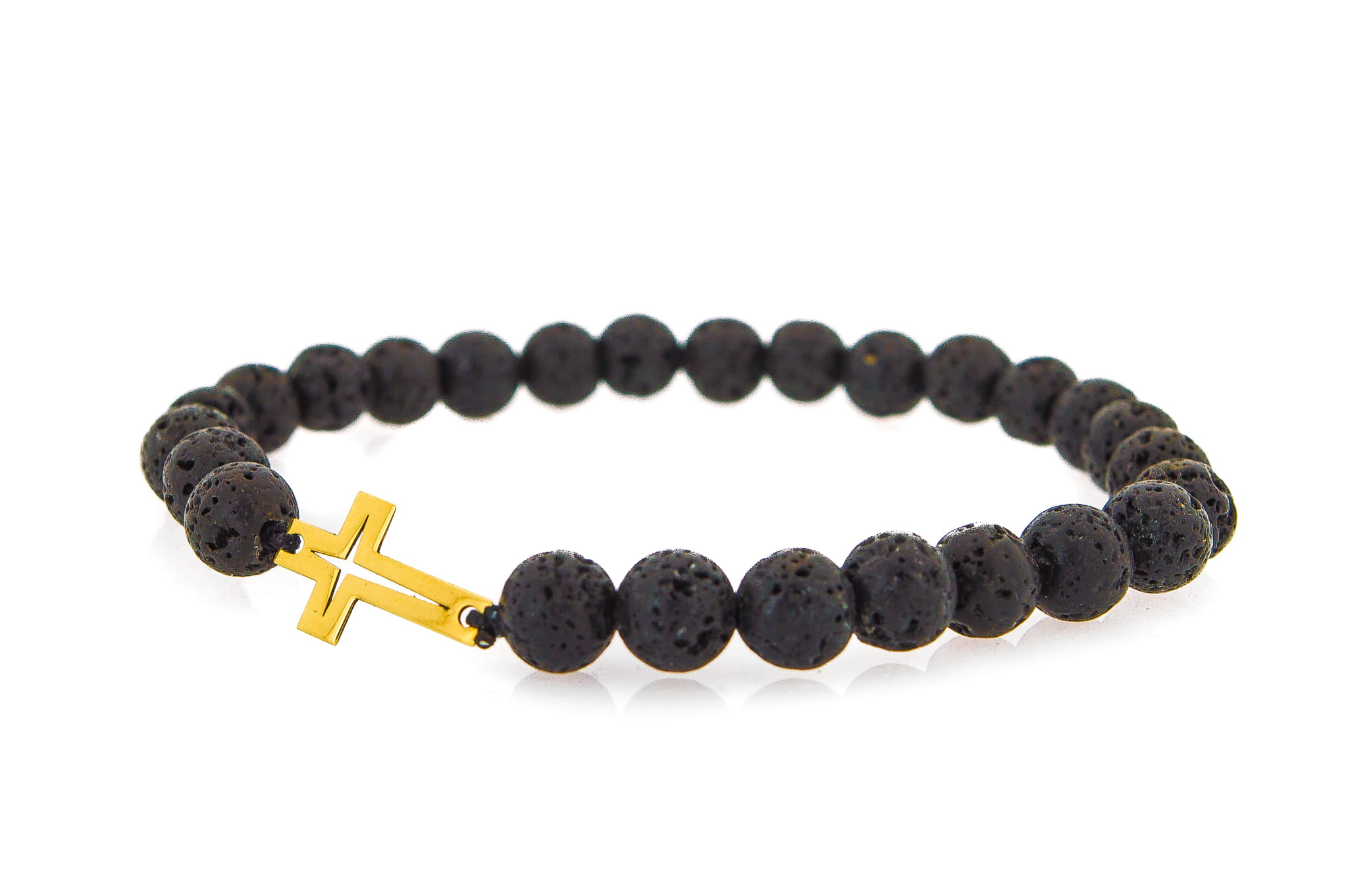 Głównym akcentem bransoletki jest nowocześnie wycięty, złoty krzyż o wymiarach 15 mm x 9 mm, wykonany z trwałego złota próby 375. Lśniąca powierzchnia kruszcu doskonale kontrastuje z matową lub półmatową strukturą okrągłych kamieni o średnicy 6 mm.