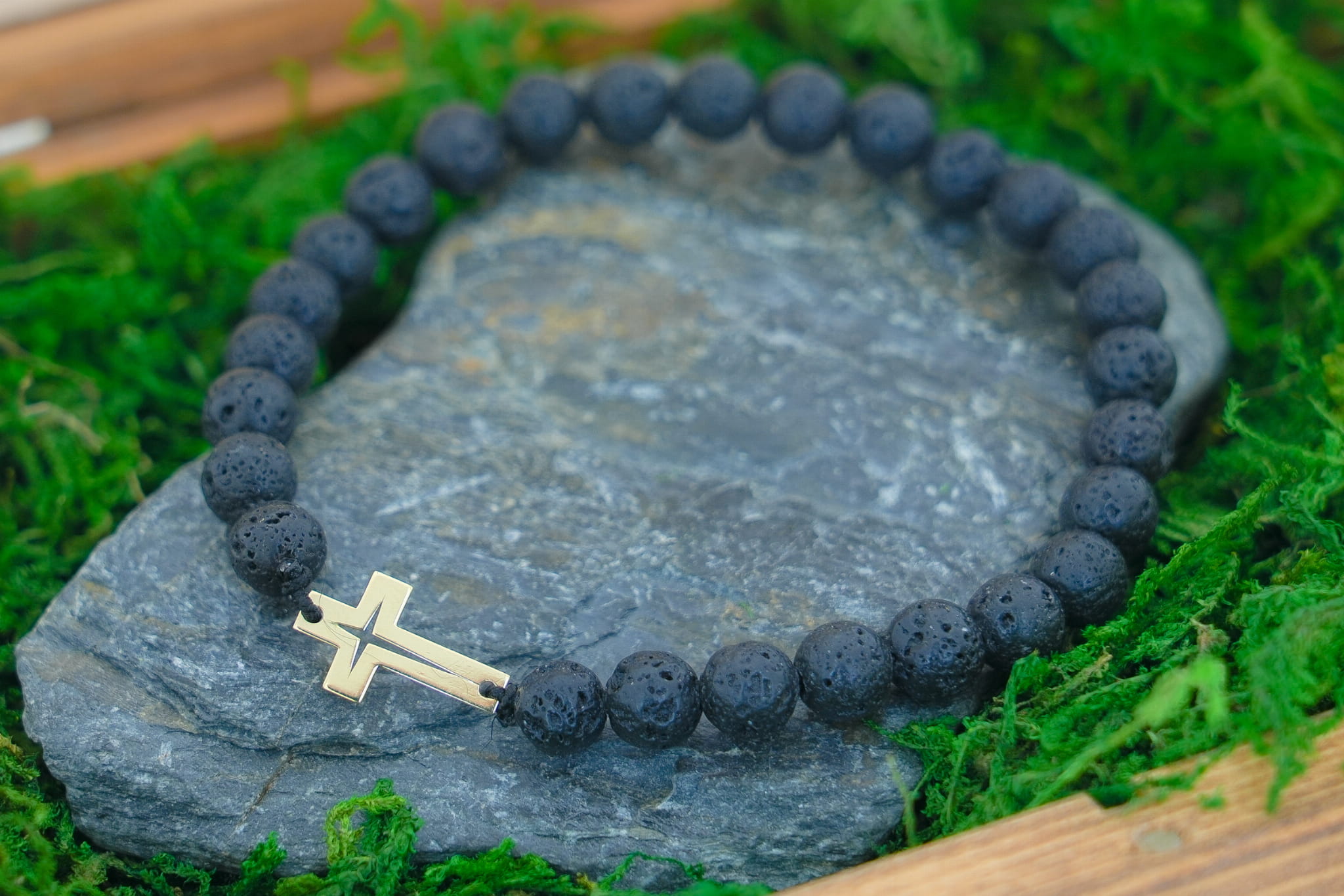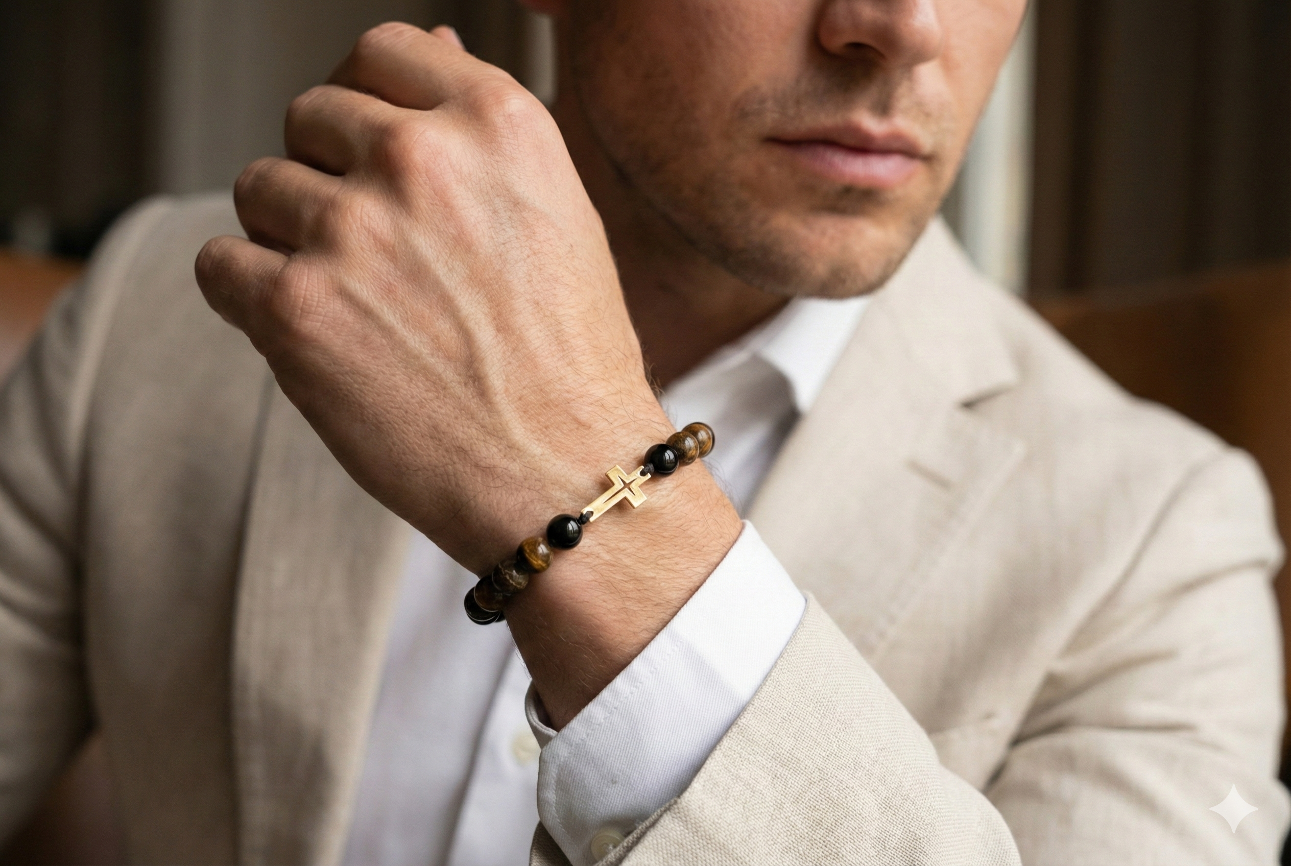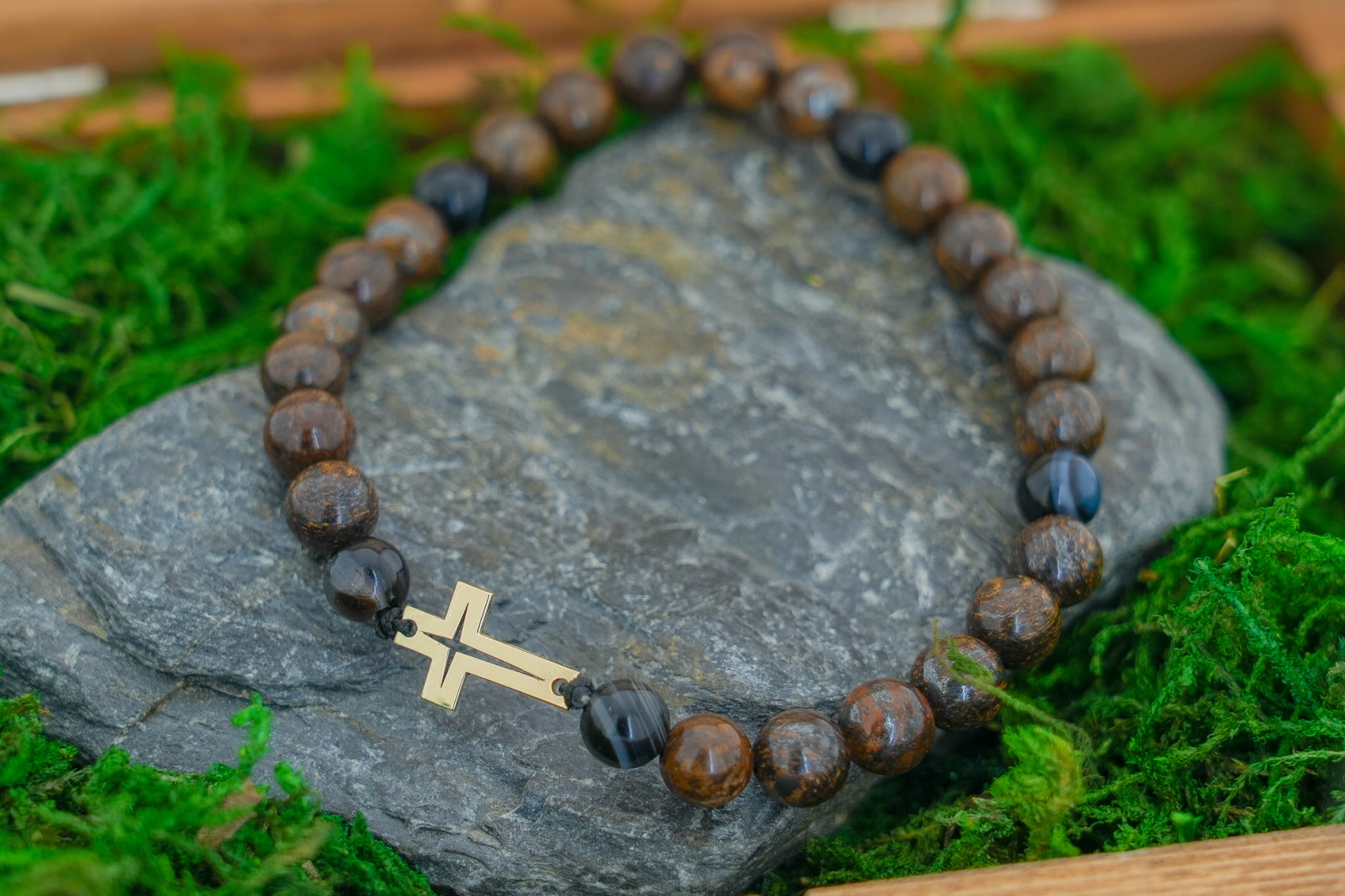 Męska Bransoletka z Kamieni Naturalnych – Złoty Krzyż Próba 585